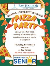 Seniors are invited to Bay Harbor for drinks, salad, pizza, dessert and companionship. This is a free event. Please RSVP to 715-426-4646.